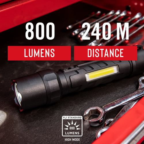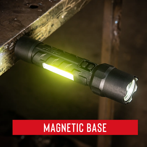 Coast designed and built the PolySteel 700 LED Flashlight to hold up to the challenges of the working world. It features white and red chip-on-board LEDs on its handle for steady or flashing light, along with a conventional 800-peak-lumen flashlight beam that adjusts between spot and flood with a simple twist of the head.