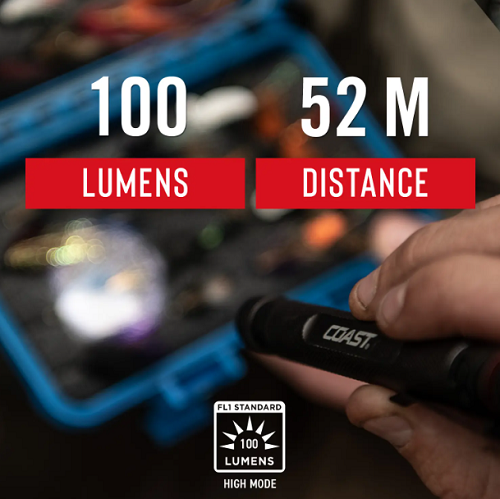 Carry close, see far. The G22 flashlight, unique among COAST pen lights, features a fixed BULLS-EYE™ Spot Beam and pocket clip to combine clip-and-carry convenience with longer-range viewing. Maxing out at 100 lumens, the two-mode beam from this sleek frame reaches 55 meters (180 feet) with a hotspot at the center and a surrounding halo of softer light to expand the viewing area. The G22 measures 4 inches long and less than one ounce—combining ultimate portability with ultra-durable construction. Made from top-grade aluminum, this go-everywhere pen light is IP54 storm proof and dust resistant, ready to shine in any weather.