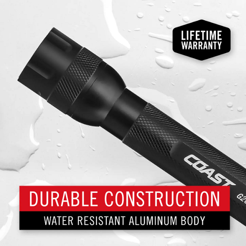 Meet everyday lighting needs. The G24 flashlight is perfect for the truck, kitchen drawer, or nightstand—shining 400 lumens with a beam length of 146 meters on high, ideal for those unexpected situations when all you need is a good light. The BULLS-EYE™ Spot Beam shines bright with a piercing center and surrounding halo of softer light for an expanded viewing area. The G24 runs 22 hours on a single set of batteries, has two light modes—high and low—and is available in black and silver finishes with diamond-pattern texturing for better grip. Just over 6 inches long but built from top-grade aluminum, this general-purpose flashlight is IP54 storm-proof and dust-resistant, so that you are ready to go whenever life comes calling. With Coast’s commitment to quality, the G24 Flashlight is impact resistant, weather resistant and its LEDs are virtually unbreakable. The G24 Flashlight is backed by Coast’s lifetime warranty against defects in materials and workmanship. Tested and rated to ANSI/FL1 standards.