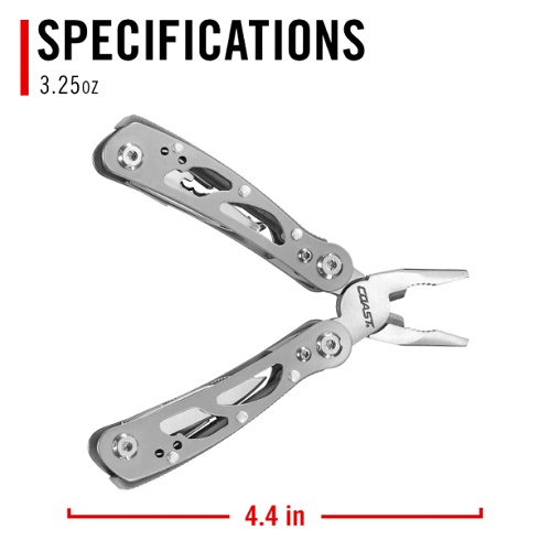 Prepare like a pro with a tool fit for every job. The CT211 multi-tool packs 11 versatile implements into a 4.4-inch, 3.25-ounce stainless steel frame with a sand-blasted finish. Open up the handle to grip, twist, and pull using the needle nose pliers, or cut through heavy-gauge wire with the wire cutter. From the closed position, the straight-edge and serrated knives set up you to slash through diverse challenges, while the three screwdriver formats—mini flathead, regular flathead, and Phillips—ensure you’re always on-point to take the problem apart or tighten things up. Other tools include: a file, nail cleaner, bottle opener, and leather punch. The CT211, like all COAST knives and multi-tools, is built with highest-grade materials and backed by a lifetime warranty.