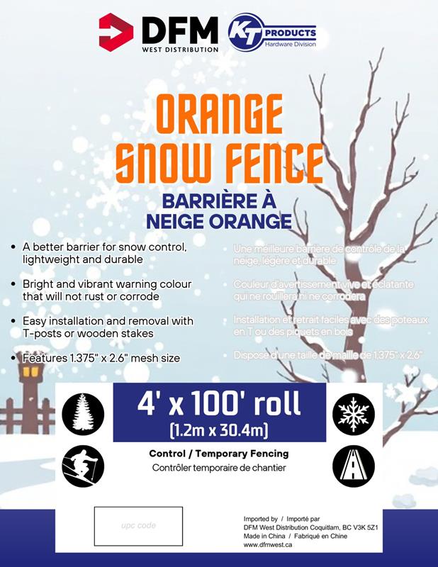 A better barrier for snow control, lightweight and durable. Bright and vibrant warning colour that will not rust or corrode. Easy installation and removal with T-posts or wooden stakes. Features 1.375" x 2.6" mesh opening size. 4' x 100' roll.